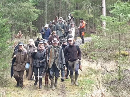 Grupp människor vandrar genom skog, vissa utrustade med ryggsäckar och kläder för utomhusaktiviteter.