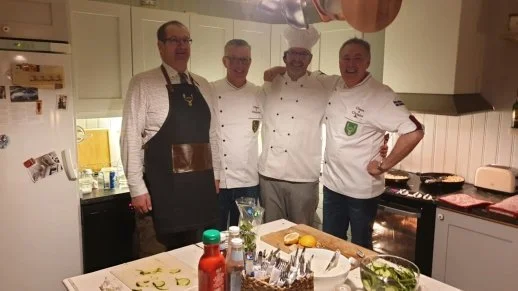 Fyra personer står tillsammans i ett kök, klädda i köksuniformer. De står bakom ett bord med mat och ingredienser. Alla ler och ser glada ut.