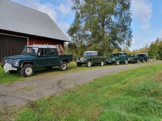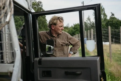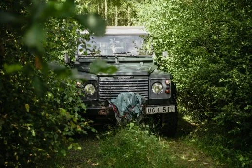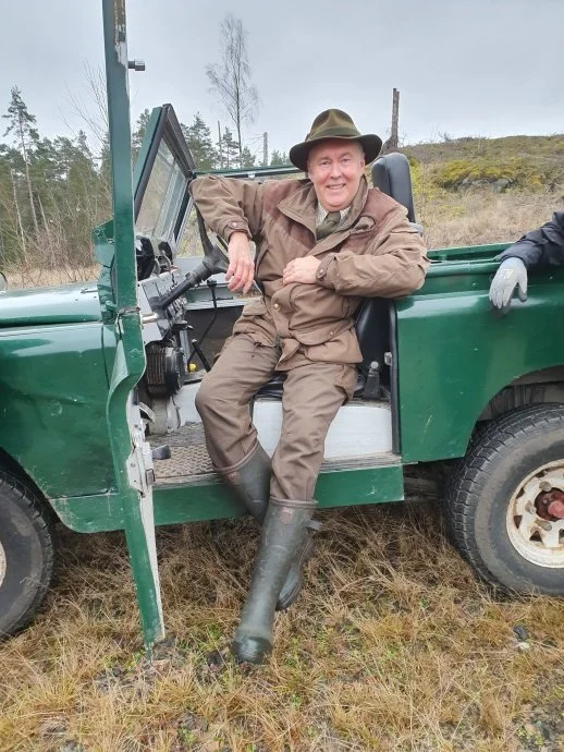 Man med hatt och utomhuskläder sitter i ett grönt fordon, troligtvis en jeep, på en äng med lågt gräs och träd i bakgrunden.