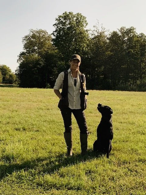 Kvinna med hund i ett grönt fält under en klar himmel.