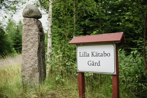 Stenkonstverk och skyltskylt med texten 'Lilla Kätabo Gård' vid skogsområde.