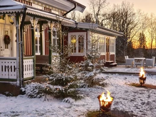 Juldekorerad stuga med snö, utomhuseld och snötäckta träd vid solnedgång.