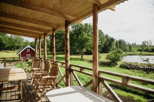 Trägårdsåtkomst med utsikt över grönskande landskap och en liten sjö, sedd från ett träutomhuskök eller veranda.