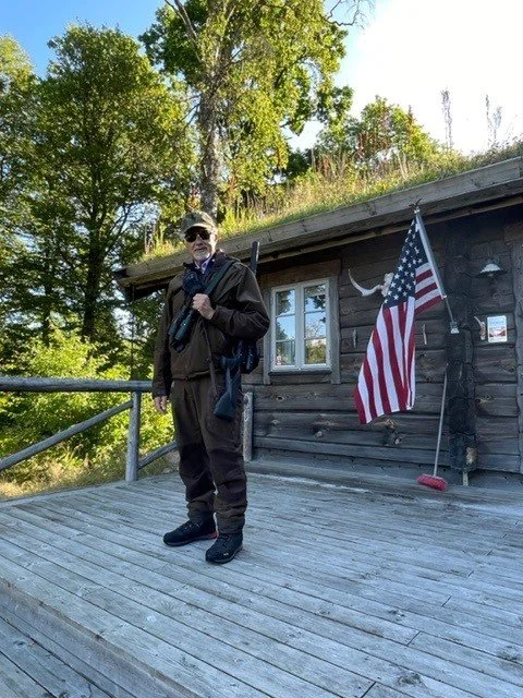En man står på en träplattform framför ett litet trähus, där en amerikansk flagga vajar. Mannen är iklädd mörka kläder och solglasögon, med en ryggsäck och gevär.