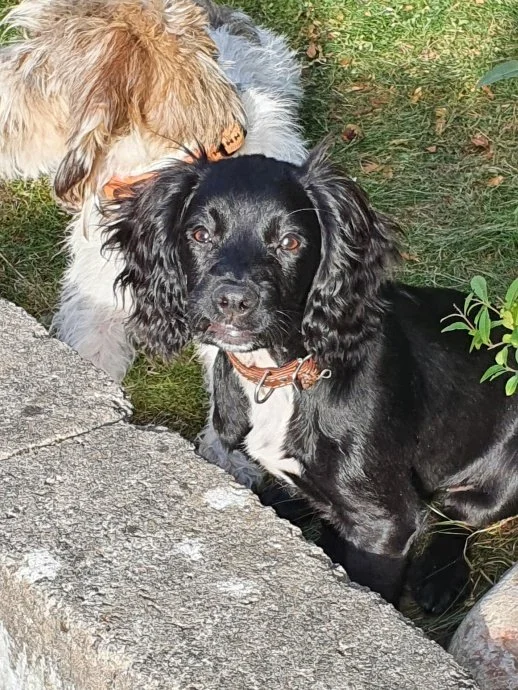 Två hundar, en svart och en med ljusbrunt och vitt, utomhus på gräs bredvid en sten och lite växtlighet.